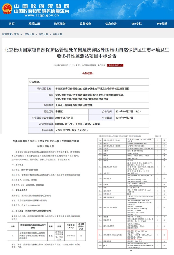 喜報!恭賀我司UV-1800雙光束紫外可見分光光度計中標由新華招標有限公司組織的“北京松山國家級自然保護區(qū)管理處冬奧延慶賽區(qū)外圍松山自然保護區(qū)生態(tài)環(huán)境及生物多樣性監(jiān)測站項目(項目編號:XM-0000154313180809013)”采購,現(xiàn)已正式交付使用!