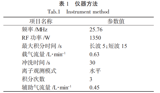 開(kāi)啟電感耦合等離子體發(fā)射光譜儀,預(yù)熱 30min, 按下表設(shè)置各項(xiàng)儀器參數(shù)。見(jiàn)表 1。