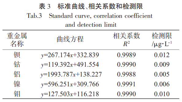 取 1.4.1 標(biāo)準(zhǔn)儲(chǔ)備溶液,分別精密量取適量,分 別置 6 個(gè) 10mL 棕色量瓶中,制備每 1.0mL 溶液中 含有 4 種待 測(cè) 金 屬 元 素 依 次 為 0.02、0.05、0.2、0.4、 0.6、1.0、4.0μg·L-1 的標(biāo)準(zhǔn)曲線溶液,加 HNO3(5.0%) 稀釋至刻度,搖勻;再按 1.3 儀器條件設(shè)置儀器,分 別將上述標(biāo)準(zhǔn)曲線溶液注入儀器,以橫坐標(biāo)為重金 屬濃度(X)、縱坐標(biāo)為響應(yīng)值(Y)進(jìn)行線性回歸,計(jì) 算曲線方程,在以 3 倍信號(hào)值和噪音值比值作為檢 測(cè)限;結(jié)果 5 種待測(cè)重金屬線性關(guān)系良好,相關(guān)系數(shù) 均大于 0.995,檢測(cè)限在 0.005~0.012μg·L-1 之間。結(jié) 果見(jiàn)表 3。
