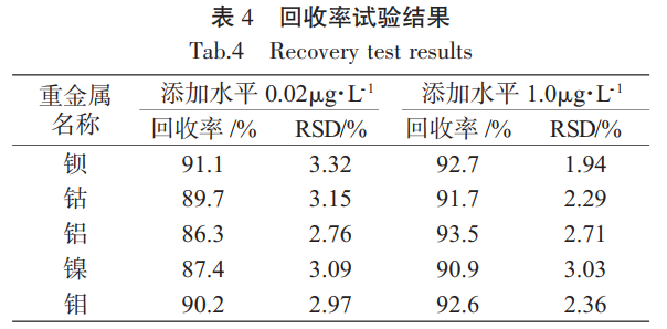 隨機(jī)取地表水(湖泊、溪流)樣品 1000mL,共取 6 份,分別精密加入 1.4.1 標(biāo)準(zhǔn)儲(chǔ)備溶液適量,后續(xù) 按 1.4.2 樣品溶液方法進(jìn)行前處理,制備含鋇、鈷、 鋁、鎳、鉬分別為 0.02 和 1.0μg·L-1 的加標(biāo)溶液;再 按 1.3 儀器條件設(shè)置儀器,分別將上述加標(biāo)溶液注 入儀器,以樣品檢測(cè)值和加入量計(jì)算回收率;結(jié)果 5 種 待 測(cè) 金 屬 2 水 平 加 標(biāo) 回 收 率 在 86.3% ~93.5% 之 間,符合要求。結(jié)果見(jiàn)表 4。