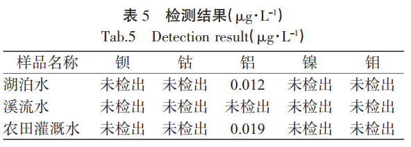 隨機(jī)取地表水樣品 1000 mL(湖泊、溪流、農(nóng)田灌溉),分別按 1.4.2 樣品溶液方法進(jìn)行前處理,每個(gè) 樣品平行制備 2 份樣品溶液,再按 1.3 儀器條件設(shè) 置儀器,分別將上述溶液注入儀器,計(jì)算地表水樣品 中鋇、鈷、鋁、鎳、鉬的含量。在湖泊水和農(nóng)田灌溉水 中檢出微量鋁殘留,結(jié)果見(jiàn)表 5。
