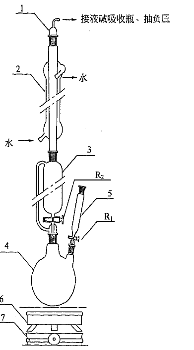 稱取5 g~10 g試樣,精確至0.01 g。放人消解瓶內(nèi),加入10 mL硫酸,按圖1安裝好消解裝置。打開冷卻水,關(guān)閉R1和R2旋塞,向分液漏斗中加人30 mL硝酸。