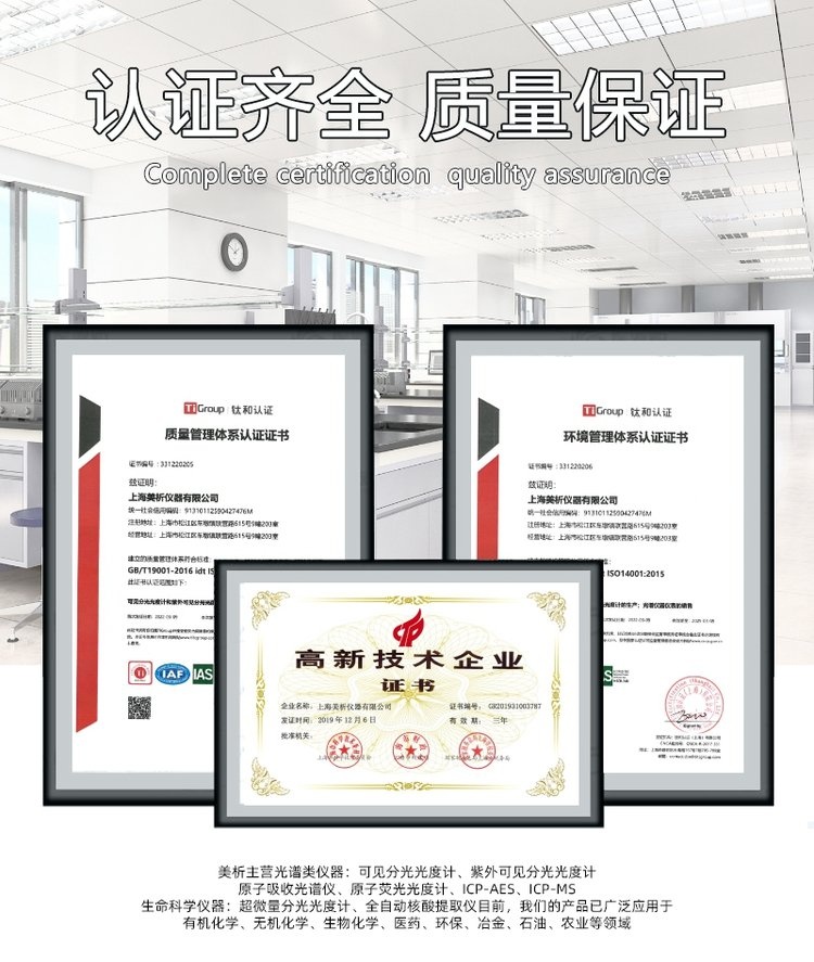 (美析儀器不僅僅只是一家高新技術(shù)認(rèn)證企業(yè),更通過了CE認(rèn)證、FCC認(rèn)證、RoHS認(rèn)證以及國內(nèi)多項資質(zhì)審查認(rèn)證,并有著多項自行研發(fā)的光譜類專利版權(quán)等等)