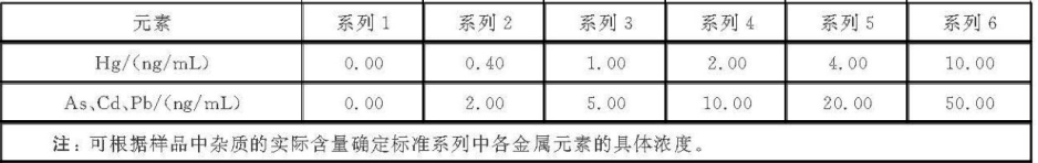 取10μg/ml砷、鉛、鎘元素混合標(biāo)準(zhǔn)溶液、2ug/mL汞、金標(biāo)準(zhǔn)溶液各5mL,用硝酸(2+98)稀釋至50 mL,成為標(biāo)準(zhǔn)使用溶液,分取此標(biāo)準(zhǔn)使用溶液0 mL、0. 10 mL、0. 25 mL、0. 5 mL、1, 0 mL、2.5mL分別置于100mL容量瓶中,用硝酸(2+98)稀釋至刻度,此混合標(biāo)準(zhǔn)工作溶液中各元素濃度見表1。