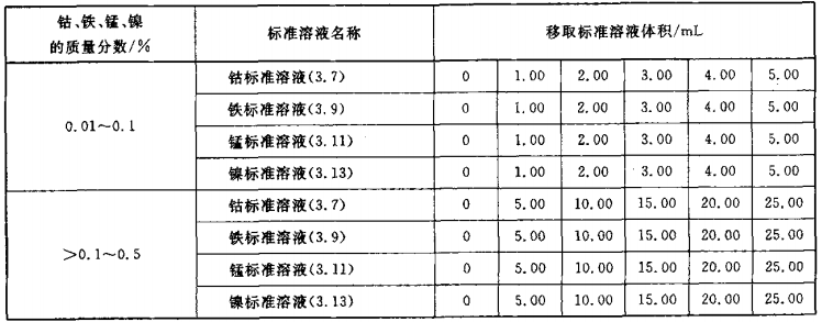 鈷、鐵、錳、鎳的質(zhì)量分?jǐn)?shù)為 0.01~0.1% 時(shí),試料質(zhì)量/g 取1g