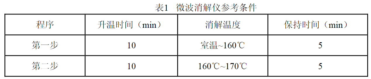 準(zhǔn)確量取45.0ml搖勻后的樣品至微波消解罐中,加入5 ml濃硝酸,加蓋密封。將微波消解罐放入微波消解儀中,參照表1中的條件進(jìn)行消解。消解完畢后,冷卻至室溫。將消解液移至50ml容量瓶中,用水定容至刻度,搖勻,待測(cè)。