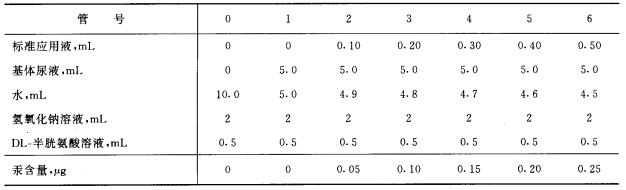 吸取5.0 mL尿樣于10 mL具塞試管中,加入5 mL水,2 mL氫氧化鈉溶液,0.5 mlDL-半胱氨酸溶液v混勻。