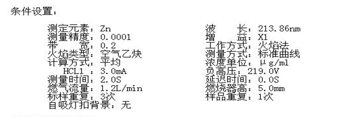 選取濃度50 mg/L的混合標準溶液放入容積為10 mL的容量瓶中,每一種溶液各取2 mL,通過去離子水進行稀釋,直到瓶內(nèi)溶液升至刻度線,以上元素的濃度均稀釋為10 mg/L,依次選取0,0.2,0.8,1.4,2.0 mL的該系列標準鐵溶液放入容量為10mL的容量瓶,往瓶中添加0.2 mL的5 %鑭溶液,加入0.1 mL的硝酸,通過去離子水將其稀釋到刻度線,使該系列標準溶液濃度分別為0,0.2,0.8,1.4,2.0 mg/L,根據(jù)以下的工作條件開展測定,標準溶液測定工作完成后馬上進行試液中各元素的含量測定。