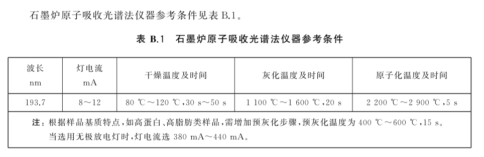 儀器參考條件見附錄 B 中表 B.1 。采用氘燈、自吸收或塞曼效應扣除背景。