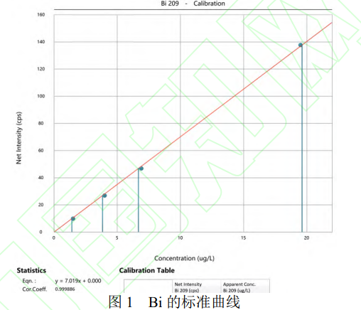 通過(guò)0、1.5、4.0、7.0、19.0μg/L5個(gè)質(zhì)量濃度水平的線性回歸方程來(lái)考察方法的線性,得到Bi的線性方程為:y=7.019x+0.000,線性相關(guān)系數(shù)R為0.9998,相關(guān)譜圖見圖1。