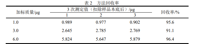 以1.0、3.0、6.0μg3個(gè)不同質(zhì)量的加標(biāo)測(cè)定回收率。經(jīng)計(jì)算得加標(biāo)回收率分別為95.6%、91.1%及96.4%,結(jié)果見表2。由表2可知,各加標(biāo)質(zhì)量下回收率大于90%,結(jié)果較好。