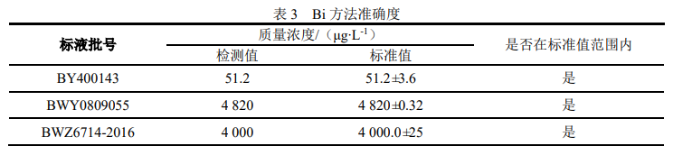 選用3個(gè)不同質(zhì)量濃度的國(guó)家標(biāo)準(zhǔn)物質(zhì),按本方法進(jìn)行測(cè)定,計(jì)算得Bi實(shí)測(cè)值與標(biāo)準(zhǔn)值進(jìn)行比對(duì),驗(yàn)證方法的準(zhǔn)確性,結(jié)果見表3。