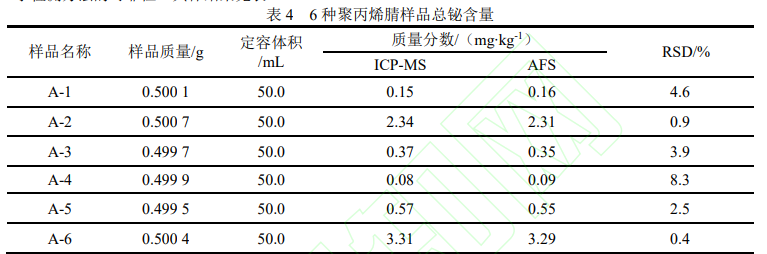 分別取6個(gè)不同批次聚丙烯腈樣品經(jīng)微波消解后,定容至50.0mL,采用ICP-MS測(cè)定,再用AFS進(jìn)行驗(yàn)證,采用ICPMS和AFS檢測(cè)結(jié)果進(jìn)行比對(duì),檢測(cè)結(jié)果的相對(duì)標(biāo)準(zhǔn)偏差RSD均在10%以內(nèi),進(jìn)一步驗(yàn)證了檢測(cè)方法的可靠性。具體結(jié)果見表4。