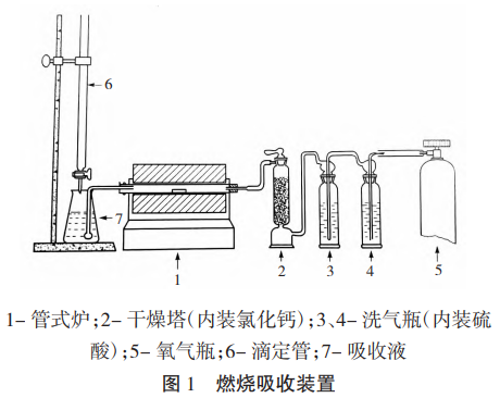 稱取0.2~0.5g地質(zhì)樣品,精確至0.0002g,均勻地平鋪于預(yù)先墊有石英砂助溶劑的瓷舟中,再在樣品上覆蓋薄薄一層助溶劑。連接好定硫儀裝置,檢查全部裝置是否密閉,調(diào)節(jié)電壓在65V左右,待溫度升至400℃,逐漸升高電壓,升高溫度至1300℃。在吸收杯中準(zhǔn)確加入25.0mL事先配制好的淀粉稀鹽酸吸收液-碘酸鉀標(biāo)準(zhǔn)溶液,將導(dǎo)管插到吸收液底部,調(diào)節(jié)氣流為每秒2~3個(gè)氣泡。將盛有樣品的瓷舟推入管爐中預(yù)定位置(蕞熱的部分),通入氧氣到吸收液中,剛開(kāi)始時(shí)調(diào)節(jié)出氣閥門使氣體小氣泡排出,保持3min,然后調(diào)節(jié)至大氣泡排出,再保持2min后取下吸收杯,蓋上蓋子,待測(cè),同批做空白試驗(yàn)。(注:當(dāng)吸收液藍(lán)色萬(wàn)泉消退,需改變稱樣量或吸收液濃度。)