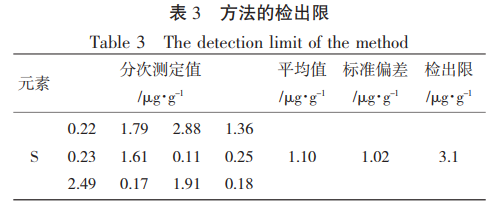 儀器在穩(wěn)定的條件下,使用該分析方法連續(xù)分析十二次樣品空白,計(jì)算該方法的標(biāo)準(zhǔn)偏差,然后三倍的標(biāo)準(zhǔn)偏差記作方法的檢出限,得出ICP-OES法測(cè)硫的檢出限為3.1μg/g。