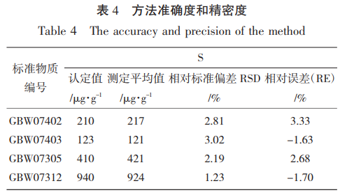 按照技術(shù)規(guī)范的要求選擇四個(gè)低、中、高三種含量的國(guó)家一級(jí)標(biāo)準(zhǔn)物質(zhì)分別測(cè)定十二次,并計(jì)算其相對(duì)誤差(RE)與相對(duì)標(biāo)準(zhǔn)偏差(RSD),相對(duì)誤差在-1.70%~3.33%之間,相對(duì)標(biāo)準(zhǔn)偏差在1.23%~3.02%之間,結(jié)果均滿足技術(shù)規(guī)范的要求。