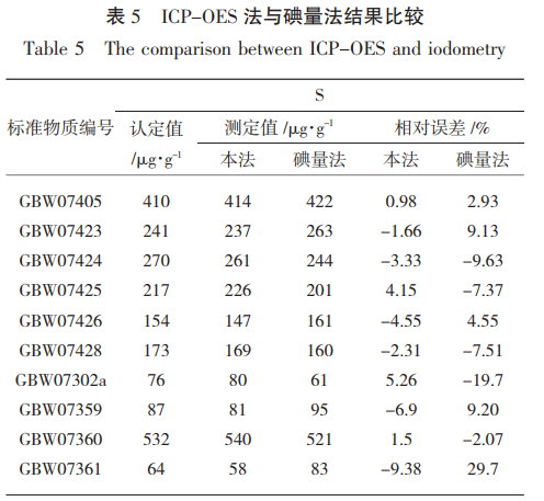 由表5我們可以看出,用ICP-OES法測(cè)定全硫與碘量法測(cè)定全硫的結(jié)果對(duì)比,本方法相對(duì)標(biāo)準(zhǔn)誤差(RD)在-9.38%~5.26%之間,而碘量法相對(duì)標(biāo)準(zhǔn)誤差(RD)在-9.63%~29.7%之間,ICP-OES法測(cè)定結(jié)果相對(duì)誤差更小,尤其是對(duì)于低含量的硫分析,ICP-OES法測(cè)定結(jié)果更準(zhǔn)確。