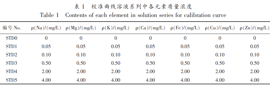 650mL塑料容量瓶中,根據(jù)表1中校準(zhǔn)曲線溶液系列中各元素含量,加入1.2中待測元素標(biāo)準(zhǔn)溶液,加入1+1硝酸2mL,用超純水稀釋zhi刻度,搖勻,制備多元素校準(zhǔn)曲線標(biāo)準(zhǔn)溶液系列。
