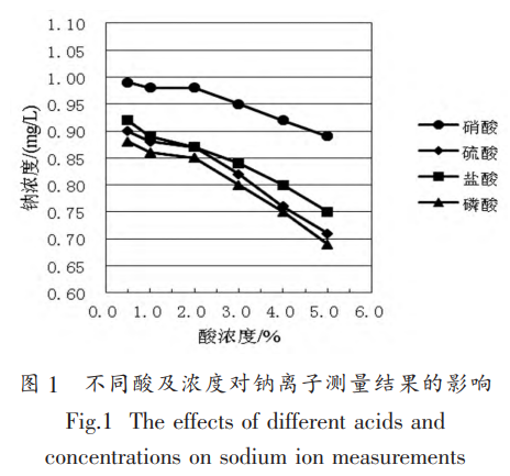 不同酸及濃度對鈉離子測量結(jié)果的影響見圖1。不論使用哪種酸,當(dāng)酸度增大時,都會產(chǎn)生負(fù)的干擾,在硝酸、硫酸、鹽酸、磷酸等幾種常見無機(jī)酸中,硝酸對鈉的干擾相對較小,其它酸的背景吸收都較大。因此,本方法選擇用硝酸溶解試樣。結(jié)果也表明,硝酸的用量對測定結(jié)果有影響,硝酸濃度增加時,鈉含量的測定值下降,在硝酸體積分?jǐn)?shù)≤2%時下降幅度不ming顯??紤]到?jīng)_分溶解、靈敏度和對儀器的保護(hù),方法選用體積分?jǐn)?shù)為2%的硝酸。