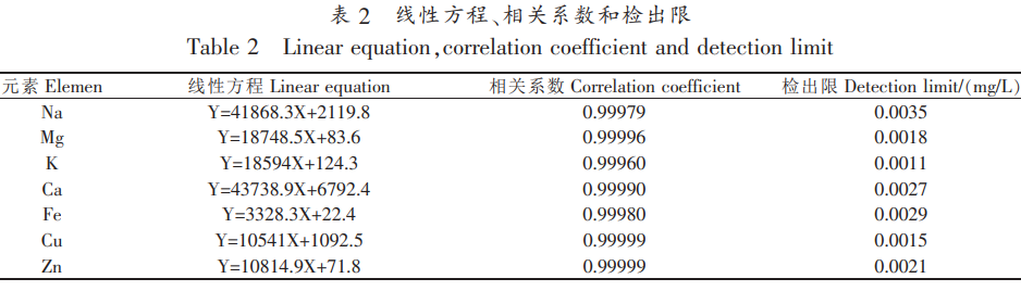 ICP-AES蕞佳工作條件:射頻功率為1150W;輔助氣(Ar)流量為0.5L/min;霧化氣流量為1.0L/min;蠕動泵泵速為60r/min;觀察高度為12mm,健側(cè)時間為30s
