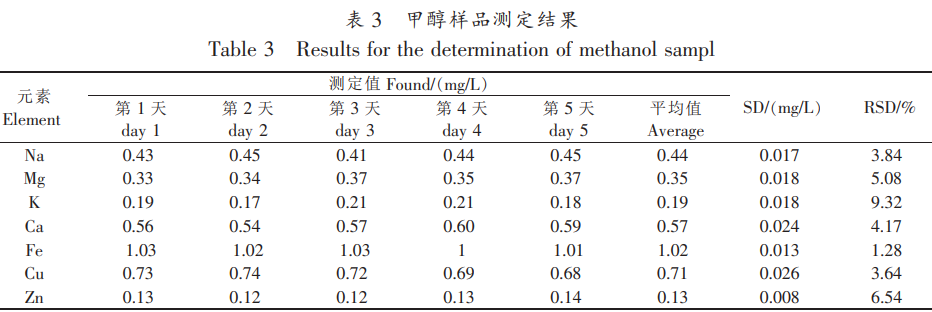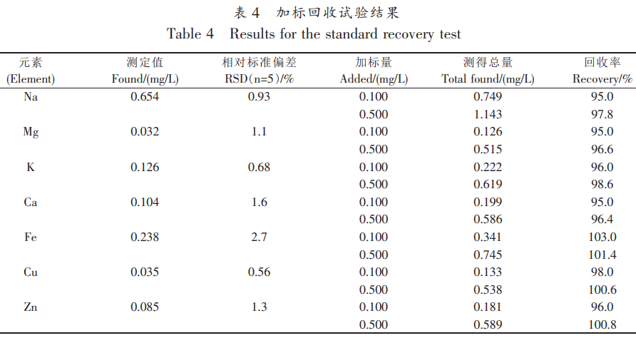 甲醇蒸干過程中可能會損失一部分金屬離子,影響方法準(zhǔn)確度。對于這一問題,可以采用加標(biāo)回收試驗來進(jìn)行驗證,結(jié)果見表4。試驗證明,各元素的加標(biāo)回收率都大于95.0%,蒸發(fā)過程中各元素的損失極小,甲醇蒸干方式及其他試驗條件選擇正確,分析結(jié)果準(zhǔn)確。