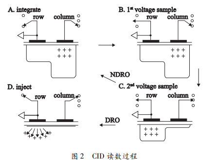 一個(gè)單獨(dú)的CID檢測單元包括兩個(gè)導(dǎo)電性的電極和引線,放置在一個(gè)很薄的硅氧化物或氮化物絕緣層上,即橫向電極(rowelectrode)和縱向電極(columnelectrode),在橫向電極上有一個(gè)讀數(shù)放大器,兩個(gè)電極之間加以偏壓,開始積分時(shí),首先在橫向電極上加以很小的正電壓,而在縱向電極上加以很小的負(fù)電壓,光照在檢測器表面時(shí),產(chǎn)生的正電荷向縱向電極上聚集,當(dāng)?shù)谝淮巫x數(shù)時(shí),將橫向電極上的正電壓去掉,同時(shí)將縱向電極上的電壓轉(zhuǎn)為小的正電壓,電荷從縱向電極上轉(zhuǎn)移到橫向電極上(圖2中B到C),即可讀出在橫向電極上聚集的電荷所產(chǎn)生的電壓,此為第一次讀數(shù)。又經(jīng)過一段積分后,將縱向電極上加以負(fù)電壓,橫向電極上加以正電壓,此時(shí)電荷從橫向電極轉(zhuǎn)移到縱向電極,此時(shí)又可讀出橫向電極上的電壓變化,即第二次讀數(shù)(圖2中C到A);然后再在橫向電極上加以負(fù)電壓,縱向電極上加以正電壓,使電荷再轉(zhuǎn)移回到橫向電極,并重復(fù)第一次讀數(shù)的過程,當(dāng)全部積分結(jié)束,進(jìn)行最后一次讀數(shù)時(shí),在兩個(gè)電極上同時(shí)加以正電壓,使電荷注入CID基體,此時(shí)讀出橫向電極上電壓的變化即為最后一次讀數(shù)的結(jié)果,此過程如圖2所示。
