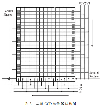 為了從電荷產(chǎn)生的檢測單元將電荷轉(zhuǎn)移到讀出電極,需將電荷從一個(gè)檢測單元轉(zhuǎn)移到其相鄰的一個(gè)檢測單元,然后再往下轉(zhuǎn)移,直到被讀出,要實(shí)現(xiàn)這一目的,每一個(gè)檢測單元內(nèi)的電場必須分成三個(gè)獨(dú)立的區(qū)域,通過控制這三個(gè)區(qū)域的電場變化來將電荷進(jìn)行移動。在這三個(gè)電極中至少有一個(gè)的電場是反相的,用于設(shè)置一個(gè)隔離區(qū)以分開其他檢測單元的電子,然后通過移動這個(gè)隔離帶的位置使電荷遷移。二維CCD檢測器結(jié)構(gòu)如圖3所示。