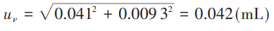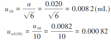(1)根據(jù)《常用玻璃量器檢定規(guī)程》(JJG196—2006)規(guī)定,標準溫度20℃時,標稱容量10mL的吸量管的容量允許差為±0.020mL(A等級),被測量值落在該區(qū)間內(nèi)的概率近似三角分布,其不確定度為: