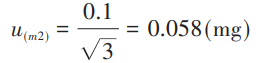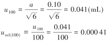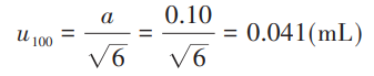 (2)標準溫度20℃時,標稱容量100mL的容量瓶容量允許差為±0.10mL(A等級),以三角分布估算其不確定度為: