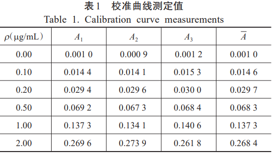 本方法采用了6個濃度水平的六價鉻校準溶液繪制校準曲線,用原子吸收分光光度計平行測定3次,擬合的校準曲線為y=0.1334x+0.0023,相關系數(shù)為0.9996,測量結(jié)果見表1。