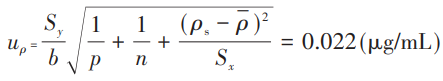 按測量過程制備被測溶液,測定標準溶液后立即測定兩次被測溶液,用標準曲線計算得到被測溶液濃度ρ兩次測定平均值為2.43mg/mL,由校準曲線擬合引入的不確定度為: