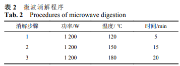 口服溶液劑、合劑(編號:1~34):精密量取樣品1mL,置消解罐中,加入硝酸8mL,100℃預(yù)消解30min,放冷,密塞,微波消解(消解程序見表2),放冷,取出。將消解液轉(zhuǎn)移至50mL量瓶內(nèi),用少量2%硝酸溶液洗滌消解罐3次,合并洗滌液,用2%硝酸溶液定容至刻度,搖勻,作為供試品溶液1。糖漿劑、膏劑(編號:35~54):取樣品約1g,精密稱定,置消解罐中,與口服溶液劑、合劑同法配制,作為供試品溶液2。同法平行制備空白溶液。