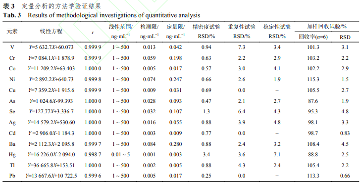 取空白溶液連續(xù)進(jìn)樣11次,以空白溶液測定值的3倍標(biāo)準(zhǔn)偏差所對應(yīng)的待測元素濃度作為檢測限,以空白溶液測定值的10倍標(biāo)準(zhǔn)偏差所對應(yīng)的待測元素濃度作為定量限,結(jié)果見表3。