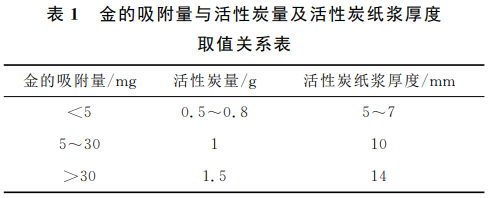 1.4試驗(yàn)裝置據(jù)文獻(xiàn),吸附柱內(nèi)裝入活性炭紙漿的厚度和活性炭量及金吸附量的關(guān)系見表1。