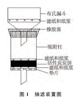 若活性炭炭餅太薄,會(huì)導(dǎo)致吸附不完全,炭餅太厚,又會(huì)使抽濾速度變慢,增加成本。通過(guò)大量試驗(yàn),碳與紙漿的干量之比1∶2為宜,吸附效果最好,既不會(huì)有明顯的白色紙漿,也不會(huì)造成浪費(fèi)。選擇約10mm的活性炭紙漿厚度,礦石品位較高的樣品,在做復(fù)查時(shí)相應(yīng)的增加活性炭紙漿厚度?;钚蕴课街闹谱鞑襟E:在吸附柱內(nèi)加入濾紙后加厚度約2mm的紙漿,保證無(wú)空隙,抽干后加入混有活性炭的紙漿約10mm(含金量較高時(shí),適度增加厚度),壓實(shí)后用水沖洗柱壁所粘附的活性炭,抽干后加入濾紙,再加約2mm的紙漿,用水沖洗柱壁,將布氏漏斗裝在吸附柱上,在布氏漏斗內(nèi)鋪上大小合適的定性濾紙一張,再次加入紙漿,使濾紙邊緣與布氏漏斗壁沒有縫隙存在,抽干后待過(guò)濾用。抽濾裝置示意圖見圖1。