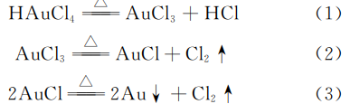 1.5.5 提取冷卻后,向瓷坩堝中加入10%氯化鉀溶液35滴,王水5mL,水浴條件下蒸至澄清后,用蒸餾水沖入25mL的比色管中并定容至刻度線,搖勻后靜置,待懸浮物沉淀后,用原子吸收分光光度計(jì)測(cè)定金含量。提取時(shí)嚴(yán)禁水浴蒸干或時(shí)間過(guò)長(zhǎng),高溫條件下,王水中的金容易轉(zhuǎn)變?yōu)槁葰浣鹚幔ǎ龋粒酰茫?span>4)晶體,該晶體在100200℃時(shí)易分解成單質(zhì)金,甚至水浴蒸發(fā)也會(huì)使該晶體分解,造成金的損失[5]。其化學(xué)反應(yīng)式見式(1)~(3)。