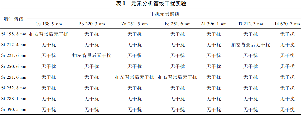選擇Si元素的8條波長(zhǎng)譜線Si198.8nmSi212.4nm、Si221.6nmSi250.6nm、Si251.6nm、Si252.8nm、Si288.1nmSi390.5nm,在Si高質(zhì)量濃度標(biāo)準(zhǔn)溶液中分別加入高質(zhì)量濃度的Cu、Pb、Zn、Fe、Al、Ti標(biāo)準(zhǔn)溶液,使Si質(zhì)量濃度在200μg/mL、Cu質(zhì)量濃度在20μg/mL、Pb質(zhì)量濃度在20μg/mLZn質(zhì)量濃度在20μg/mL、Fe質(zhì)量濃度在150μg/mLLi質(zhì)量濃度在150μg/mL,模擬金屬礦石消解后的待測(cè)定溶液進(jìn)行光譜譜線選擇和光譜干擾實(shí)驗(yàn),結(jié)果如表1所示。綜合考慮干擾譜線波長(zhǎng)、背景扣除位置、測(cè)定的準(zhǔn)確度等因素,最終確定Si波長(zhǎng)251.6nm為最佳測(cè)定譜線。