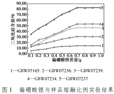 準(zhǔn)確稱取礦樣0.1g于石墨坩堝內(nèi),稱取0.3g偏硼酸鋰與樣品混勻,再稱取0.4g偏硼酸鋰均勻覆蓋于表層,常溫放置于高溫箱式電爐,待升溫至950℃時(shí),保持15min后及時(shí)取出,冷卻后放入250mL燒杯中,加入(6+4)鹽酸50mL,置于恒溫電熱板上將坩堝內(nèi)的熔融物溶解,用稀鹽酸將坩堝沖洗干凈后取出,將溶液定容至250mL容量瓶中,用電感耦合等離子體發(fā)射光譜儀測(cè)定二氧化硅的質(zhì)量分?jǐn)?shù)。