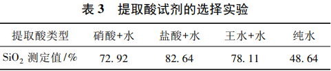 樣品經(jīng)偏硼酸鋰熔融后,如果單純用水溶解會(huì)出現(xiàn)提取時(shí)間過(guò)長(zhǎng)且溶解不完全、沉淀析出的現(xiàn)象,導(dǎo)致測(cè)定結(jié)果不準(zhǔn)確以及測(cè)定時(shí)霧化器堵塞,所以提取偏硼酸鋰熔融珠時(shí),需要選擇合適的酸試劑和酸度。礦樣中的硅溶于酸形成可溶性硅酸,但當(dāng)提取酸度過(guò)大時(shí),硅酸又會(huì)形成沉淀,導(dǎo)致結(jié)果偏低。為了考察提取酸試劑和酸度,按照1.5的步驟,選擇在250mL燒杯中分別加入50mL體積比為1∶1的硝酸+水、鹽酸+水、王水+3種提取試劑,對(duì)多金屬礦國(guó)家一級(jí)標(biāo)準(zhǔn)物質(zhì)GBW07237(SiO2質(zhì)量分?jǐn)?shù)為82.95%)進(jìn)行提取酸試劑選擇實(shí)驗(yàn),結(jié)果如表3所示。由表3中可以看出,硝酸+水、鹽酸+水、王水+水對(duì)偏硼酸鋰熔融珠進(jìn)行提取時(shí),鹽酸+水的提取效果最佳,測(cè)定平均值最接近GBW07237(SiO2質(zhì)量分?jǐn)?shù)為82.95%)認(rèn)定值。