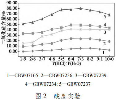 按照1.5的實(shí)驗(yàn)步驟,在250mL燒杯中分別加入體積比為1∶9、2∶8、3∶7、4∶6、5∶5、6∶47∶3、8∶29∶1、10∶0的鹽酸+水進(jìn)行提取,各平行測(cè)定6份取其平均值。對(duì)多金屬礦國(guó)家一級(jí)標(biāo)準(zhǔn)物質(zhì)GBW07165(SiO2質(zhì)量分?jǐn)?shù)為14.1%)GBW07236(SiO2質(zhì)量分?jǐn)?shù)為30.51%)、GBW07239(SiO2質(zhì)量分?jǐn)?shù)為46.67%)、GBW07234(SiO2質(zhì)量分?jǐn)?shù)為53.36%)GBW07237(SiO2質(zhì)量分?jǐn)?shù)為82.95%)進(jìn)行酸度實(shí)驗(yàn),結(jié)果如圖2所示。