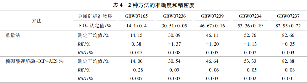 選擇金屬礦國(guó)家一級(jí)標(biāo)準(zhǔn)物質(zhì)GBW07165(SiO2質(zhì)量分?jǐn)?shù)為14.1%)、GBW07236(SiO2質(zhì)量分?jǐn)?shù)為30.51%)、GBW07239(SiO2質(zhì)量分?jǐn)?shù)為46.67%)、GBW07234(SiO2質(zhì)量分?jǐn)?shù)為53.36%)、GBW07237(SiO2質(zhì)量分?jǐn)?shù)為82.95%),分別采用本方法和動(dòng)物膠凝聚-重量法對(duì)每個(gè)標(biāo)準(zhǔn)物質(zhì)樣品平行6份,取其平均值與標(biāo)準(zhǔn)物質(zhì)認(rèn)定值進(jìn)行準(zhǔn)確度和精密度考察,結(jié)果如表4所示。