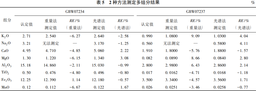 采用動(dòng)物膠凝聚-重量法測(cè)定二氧化硅時(shí),由于熔劑為氫氧化鈉,引入了大量的鈉鹽,故該方法不能測(cè)定氧化鈉,可以選擇:原子吸收分光光度法測(cè)定氧化鉀、三氧化二鐵;紫外-可見分光光度法測(cè)定三氧化二鋁、二氧化鈦、氧化錳;EDTA-容量法測(cè)定氧化鈣、氧化鎂。采用偏硼酸鋰熔融-電感耦合等離子體發(fā)射光譜法進(jìn)行前處理金屬礦樣,利用光譜法可同時(shí)測(cè)定多組分的優(yōu)勢(shì)對(duì)氧化鉀、氧化鈉、氧化鈣、氧化鎂、三氧化二鋁、二氧化鈦、三氧化二鐵、氧化錳進(jìn)行同時(shí)分析。對(duì)金屬礦國(guó)家一級(jí)標(biāo)準(zhǔn)物質(zhì)GBW07234、GBW07237進(jìn)行多組分同時(shí)測(cè)定的實(shí)驗(yàn),并對(duì)2種方法的準(zhǔn)確度(E%)進(jìn)行考察,詳細(xì)數(shù)據(jù)如表5所示。從表5中可以看出,2種方法測(cè)定金屬礦中多組分的準(zhǔn)確度均滿足地質(zhì)礦產(chǎn)實(shí)驗(yàn)室測(cè)試質(zhì)量管理規(guī)范的相關(guān)要求。