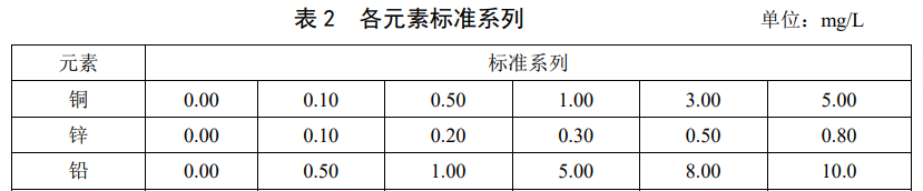 取 100 ml容量瓶,按表 2 用硝酸溶液 (1+99) 分別稀釋各元素標(biāo)準(zhǔn)使用液,配制成標(biāo)準(zhǔn)系列。