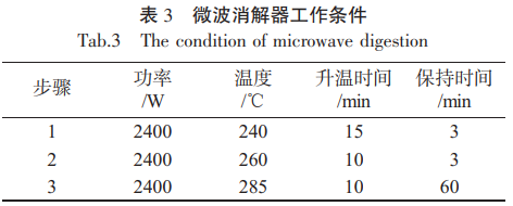 選取代表性強(qiáng)的試樣,將試樣外表面清洗干凈后,剪碎至5mm×5mm以下,準(zhǔn)確稱取試樣0.2000~0.5000g,置于潔凈干燥的聚四氟乙烯消解罐中,消解罐做好標(biāo)記,向消解罐內(nèi)加入1mL純水濕潤(rùn)試樣,再依次加入5mLHNO3和3mLH2O2,加塞后按表3中消解條件進(jìn)行微波消解。消解結(jié)束后,待消解罐完全冷卻,緩慢打開(kāi)罐蓋。用少量純水沖洗消解罐內(nèi)壁和內(nèi)蓋,加水定容至25mL,容量瓶中混勻備用。測(cè)定的同時(shí)做10%空白試樣??筛鶕?jù)試樣中重金屬含量對(duì)定容后的試樣進(jìn)行稀釋,確保試樣含量在標(biāo)準(zhǔn)曲線濃度范圍內(nèi)。