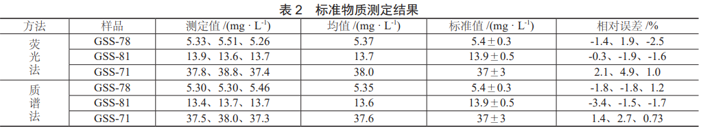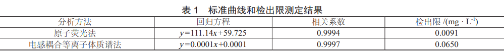 按照標準配置曲線系列,在最佳工作條件下分別測試標準曲線,原子熒光法以濃度和熒光強度為橫縱坐標繪制標準曲線,電感耦合等離子體質(zhì)譜法以濃度和CPS比值為橫縱坐標繪制標準曲線,依據(jù)文獻[9]中方法檢出限的一般確定方法,通過對最低濃度點連續(xù)7次測定,求得相對標準偏差,計算檢出限結(jié)果詳見表1,曲線線性關(guān)系良好,檢出限均低于方法標準檢出限。