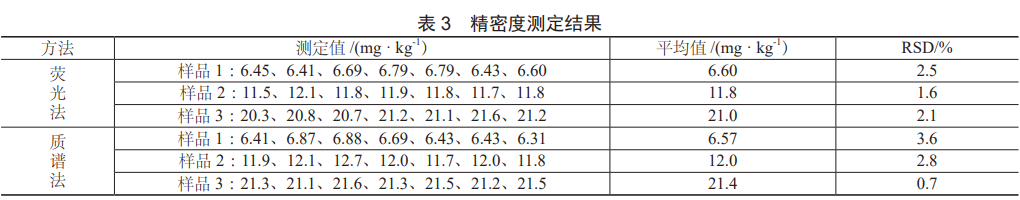 (2)精密度測定。用兩種方法對三份實際樣品進行測定,連續(xù)測試7次,求的平均值和相對標準偏差,結(jié)果詳見表3,兩種方法測得相對標準偏差均小于4%,精密度良好。