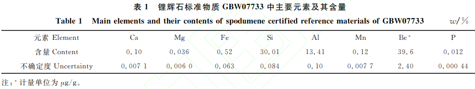 鋰輝石分析標(biāo)準(zhǔn)物質(zhì),其主要化學(xué)成分為氧化物,將其換算成元素含量,見表 1;鹽酸(GR):ρ≈1.19 g/mL;硝酸(GR): ρ≈1.41 g/mL;氫氧化鈉(AR):純度為98.0%實驗用水為電阻率達(dá) 18.25 MΩ·cm 的超純水。