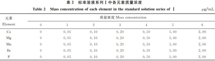 分別移取鈣、錳、鎂、鈹、磷混合標(biāo)準(zhǔn)溶液于 100m 容量瓶中,并加人 50.00 m鈉基體溶液(最終溶液中鈉質(zhì)量濃度為5.75 g/L),以水稀釋至刻度,混勻,此為鈣、錳、鎂、鈹、磷標(biāo)準(zhǔn)溶液系列工。標(biāo)準(zhǔn)溶液系列中各元素質(zhì)量濃度見表2。
