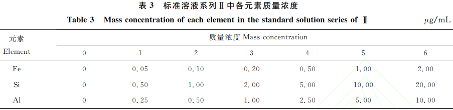 分別移取硅、鋁、鐵混合標(biāo)準(zhǔn)溶液于100m容量瓶中,并加人4.00 m鈉基體溶液(最終溶液中鈉質(zhì)量濃度為 0.46 g/L),以水稀釋至刻度,混勻,此為硅、鋁、鐵標(biāo)準(zhǔn)溶液系列Ⅱ。標(biāo)準(zhǔn)溶液系列中各元素質(zhì)量濃度見表3。