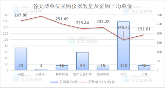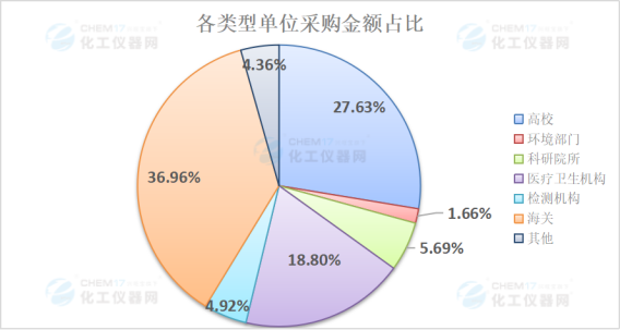 結(jié)合“各類型單位采購儀器數(shù)量及采購平均單價(jià)”和“各類型單位采購金額占比”,海關(guān)系統(tǒng)的采購需求在2024年第四季度集中釋放,成為11月質(zhì)譜儀最大采購單位。海關(guān)11月采購質(zhì)譜儀的數(shù)量為158套,占采購總數(shù)量的46.33%;采購金額為26152.4305萬元,占采購總金額的36.96%。